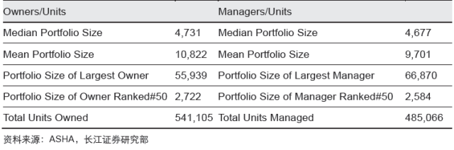 前50的規(guī)模來看兩類機(jī)構(gòu)覆蓋的單位數(shù)相差不大;最大的owner 管理的單位數(shù)是5.6萬戶,最大 的 manager 管理的單位數(shù)是 6.7 萬戶;前 50 的 owner 管理的單位數(shù)合計(jì) 54.1 萬戶, manager 管理的單位數(shù)合計(jì) 48.5 萬戶。